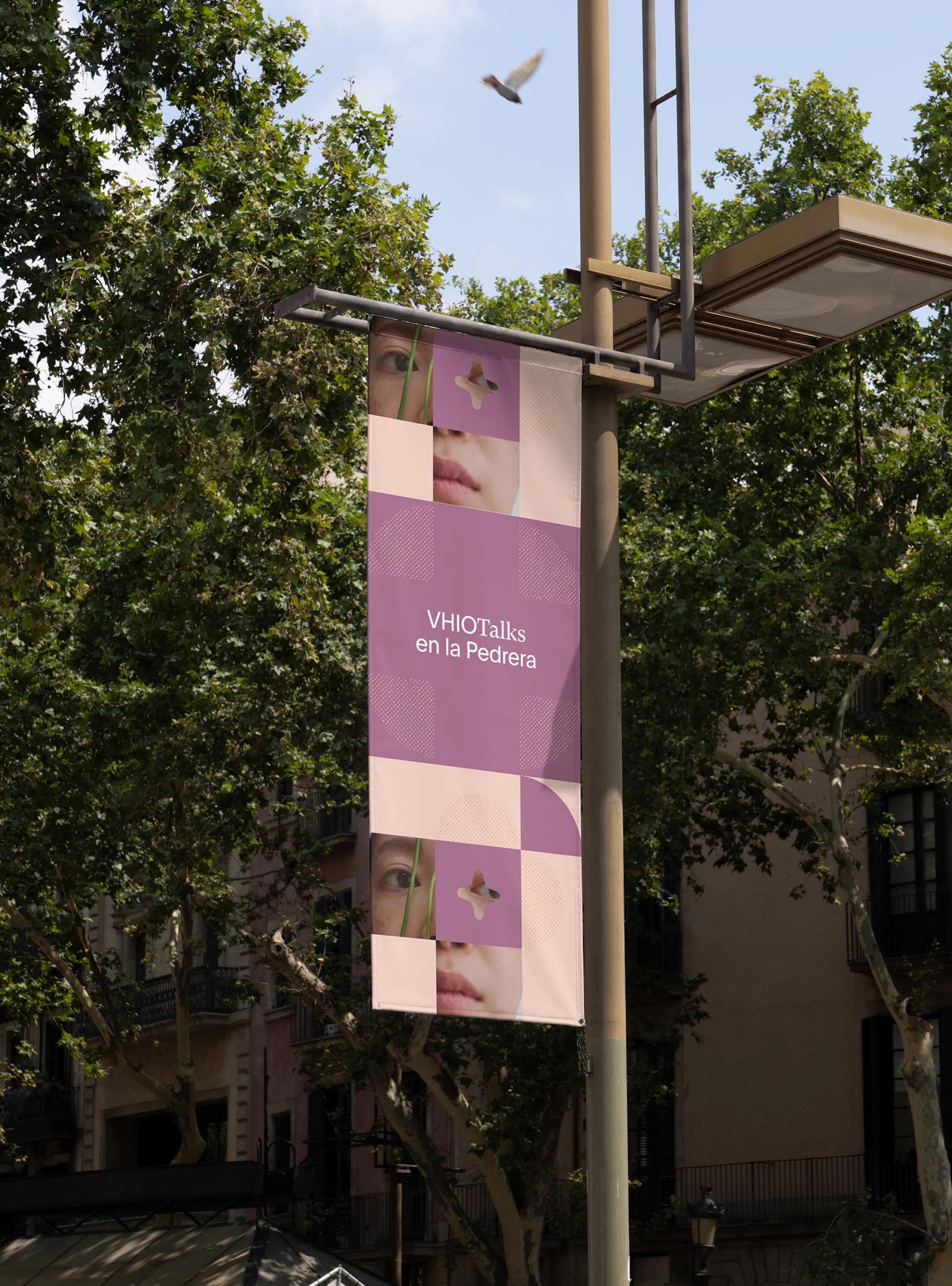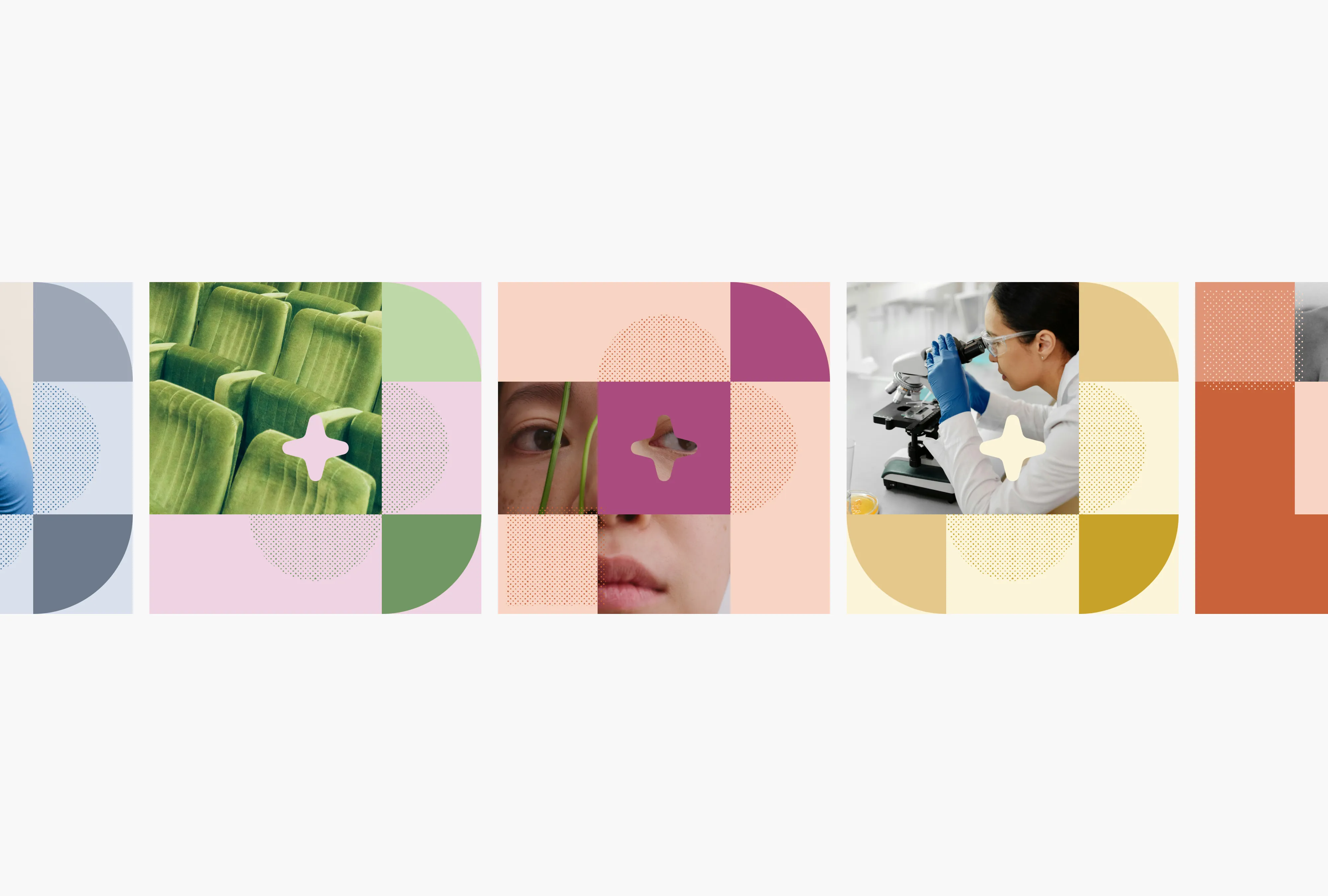 We looked to Barcelona for that language. The city's moderniste architecture, its hydraulic tiles, the geometry of the iconic panot underfoot. All of it is pattern-based, modular, endlessly recombinant. It felt like a natural analogy for how science actually works: shapes that repeat, shift, and connect until something new emerges. From that logic we built a modular illustration system, rooted in geometric forms and a flexible grid, that can flex across programmes without losing coherence.